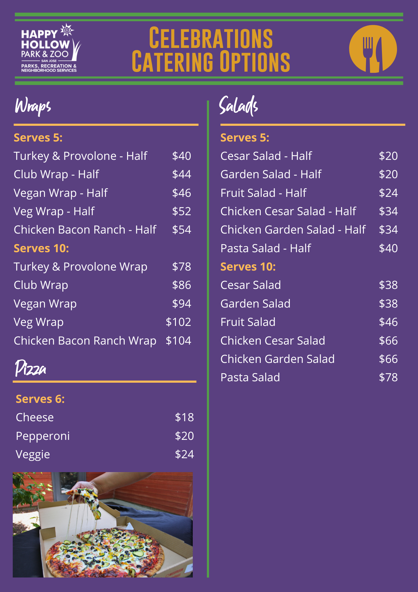 Happy Hollow offers a range of delicious meals or snacks delivered right to you for your birthday event. Please note there is a $50 minimum food purchase.